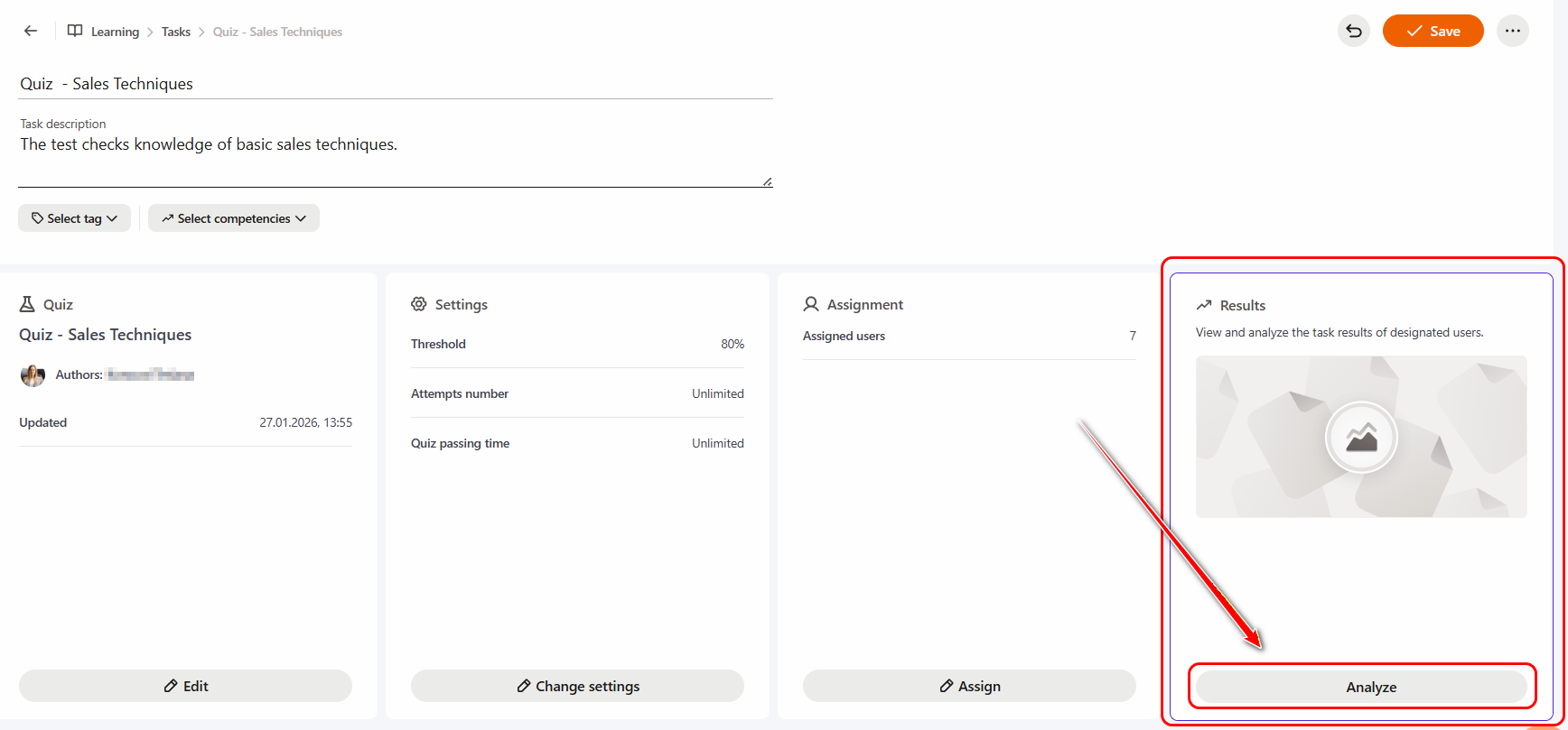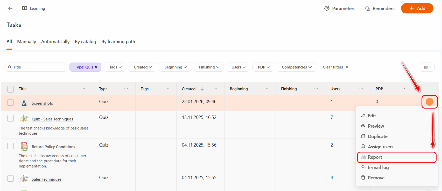 1. Through the Learning - Training reports - Quizzing report menu. (more details Quizzing report).
