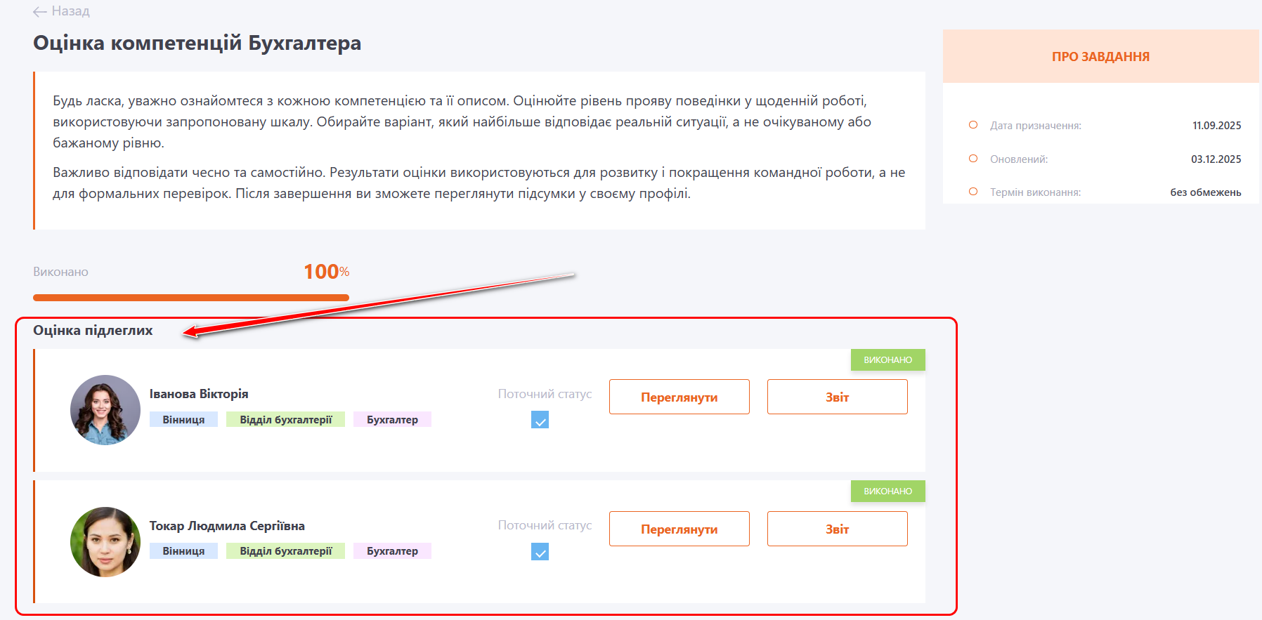 Для перегляду Протоколів з оцінки за компетенціями по підлеглим необхідно на сторінці Мої завдання перейти до відповідного завдання-оцінки: