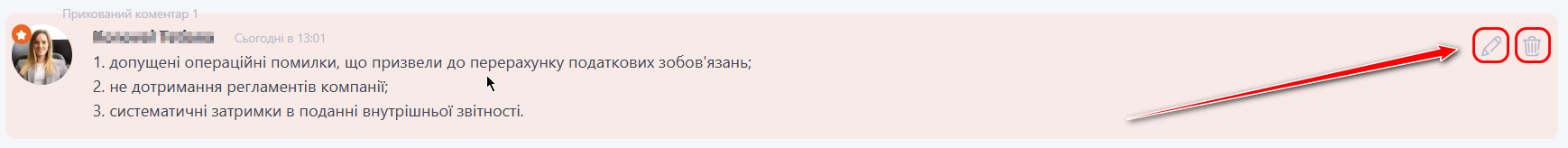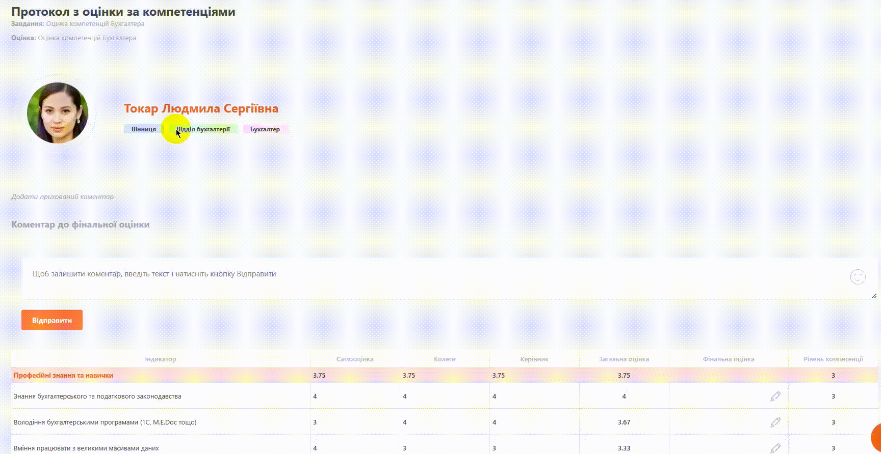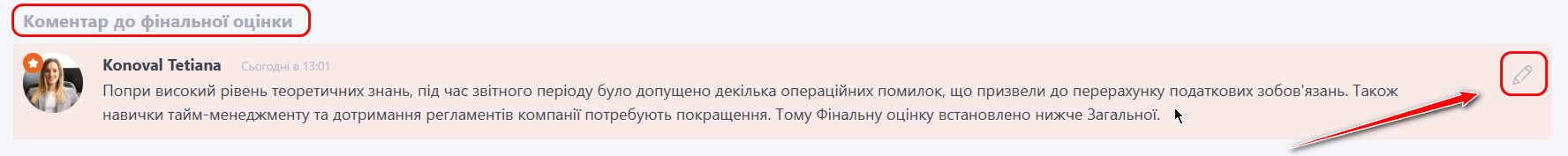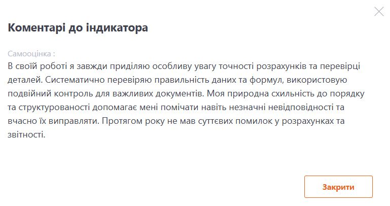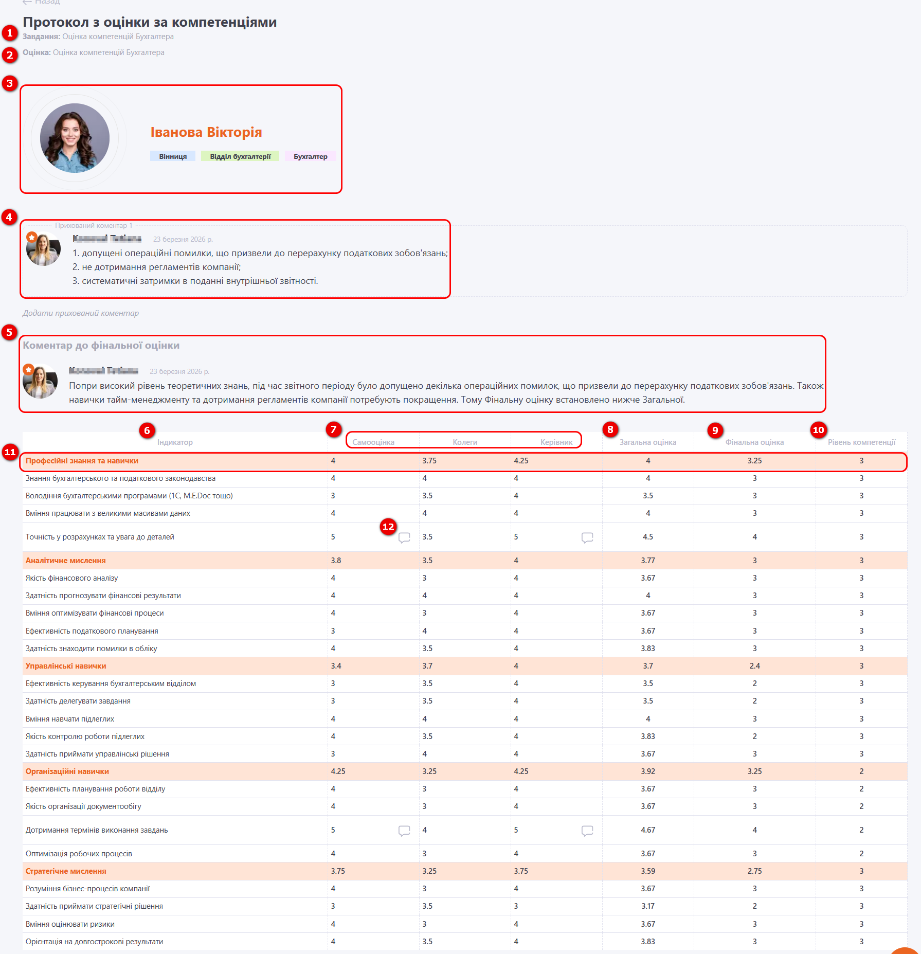 (4) - Прихований коментар - поле відображається керівнику та адміністратору за умови увімкнення опції "Додати фінальну оцінку". Воно призначене для внутрішніх нотаток щодо результатів оцінки підлеглого і не відображається самому користувачу. Заповнення поля не є обов’язковим. При наведенні курсора на текст стають доступними функції редагування та видалення.