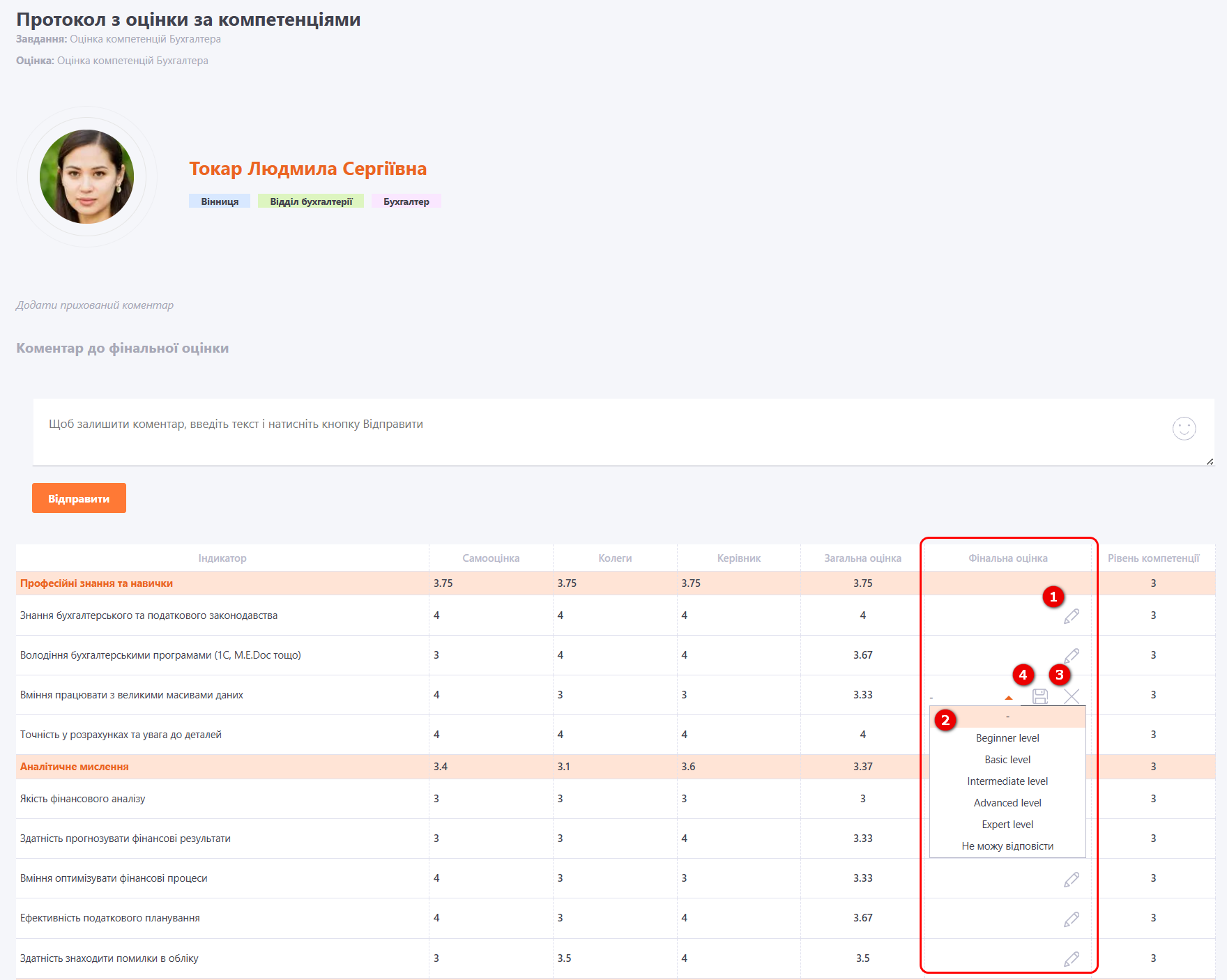 Для цього потрібно перейти до Протоколу оцінки за компетенціями та в колонці «Фінальна оцінка» натиснути кнопку Змінити (1). У випадаючому списку (2) обрати потрібний рівень для відповідного індикатора. Кнопка (3) дозволяє скасувати внесені зміни, а кнопка (4) — зберегти обрану оцінку.