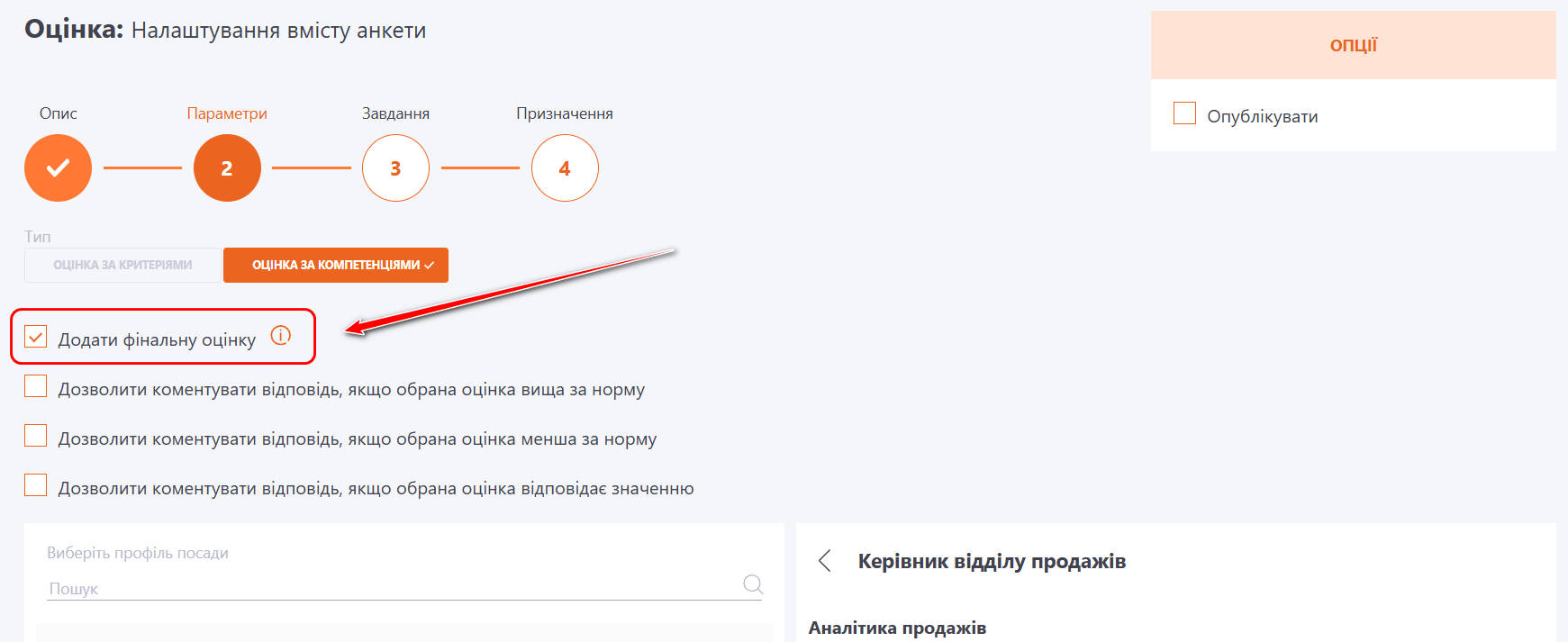 Фінальна оцінка - це оцінка, яку виставляє керівник за результатами всіх анкет на зустрічі зі співробітником. Якщо встановлено фінальну оцінку, то вона буде відображатися в профілі посади користувача. Детальніше: Перегляд профілю посади
