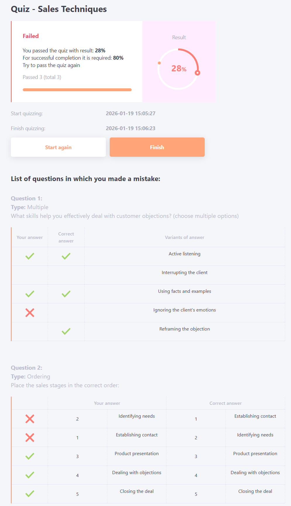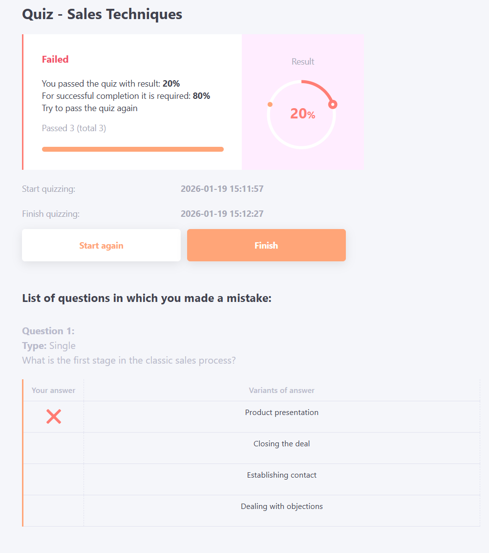 If in the settings of a quiz task enable the "Show the user after testing the protocol of wrong answers" option, then after passing the test, the user will be displayed a list of questions in which he made a mistake, indicating the selected and correct answer options.