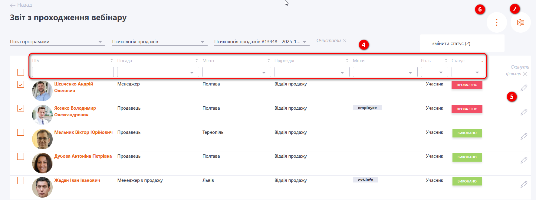 Також доступна можливість змінювати статус завдання груповою дією. Для цього необхідно виділити потрібних користувачів за допомогою чек-боксів, натиснути кнопку Дії (6), обрати Змінити статус та встановити один із статусів: Виконано або Провалено.