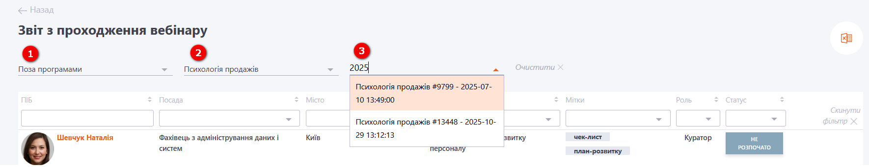 - (3) - фільтр для вибору назв завдань-вебінарів.