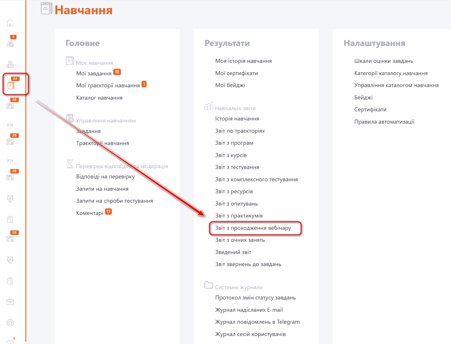 Для перегляду звітів з вебінарів потрібно перейти в меню Навчання - Навчальні звіти - Звіт з проходження вебінару