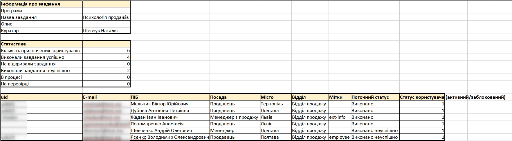 Далі відображається таблиця з користувачами, призначеними на завдання. У ній подано інформацію про кожного користувача: аватар, ПІБ, посаду, місто, підрозділ, мітки, а також результати виконання завдання.